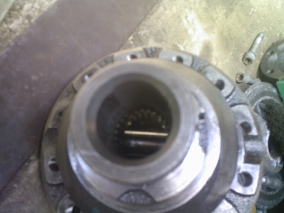 Sinna auku läheb sisse pooltelje ots. Nagu pildi pealt näha, ühte külge on sisse söönud ja selle tulemusena hakkab pooltelg mängima. See kulutab kiiremini ära tihendi ja tekkib leke. See on nüüd maakeeli selgitatud.